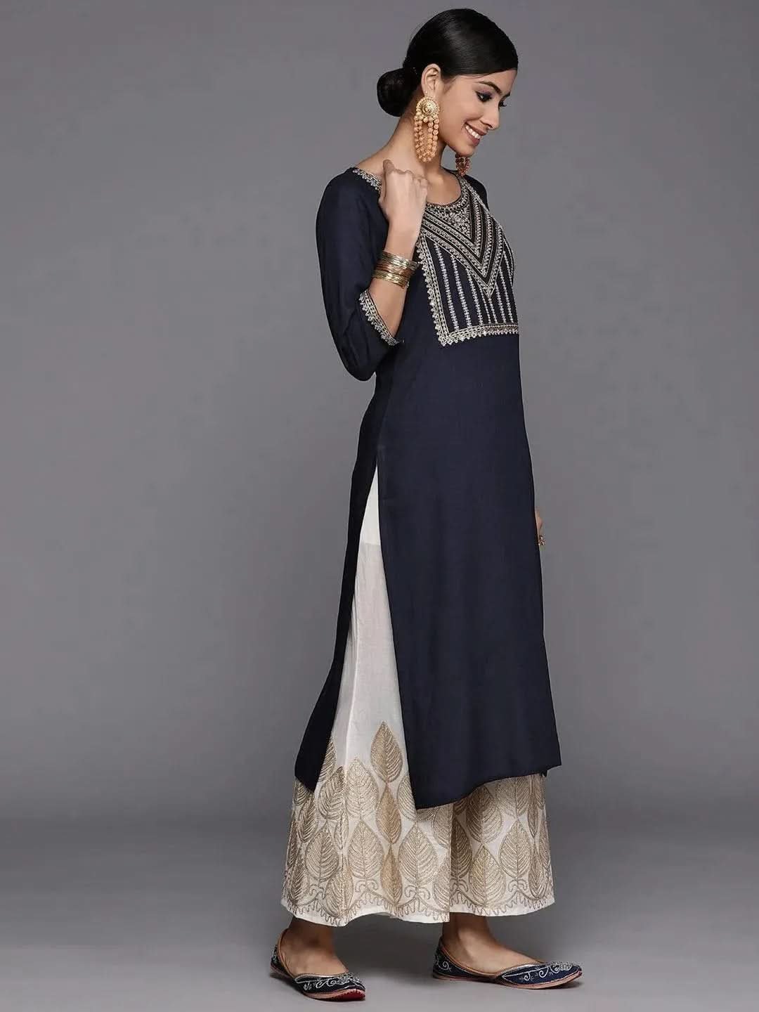 Navy Blue Yoke Design Rayon Straight Kurta