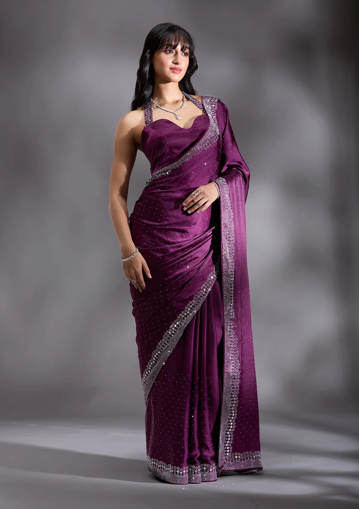 Purple Silver Stonework Satin Saree